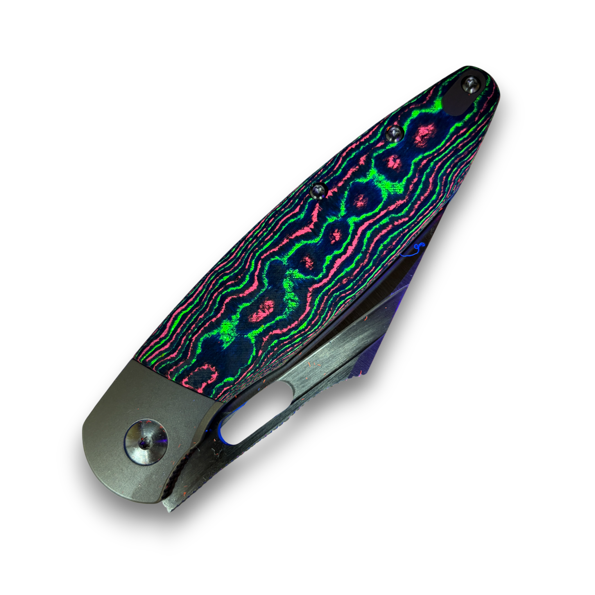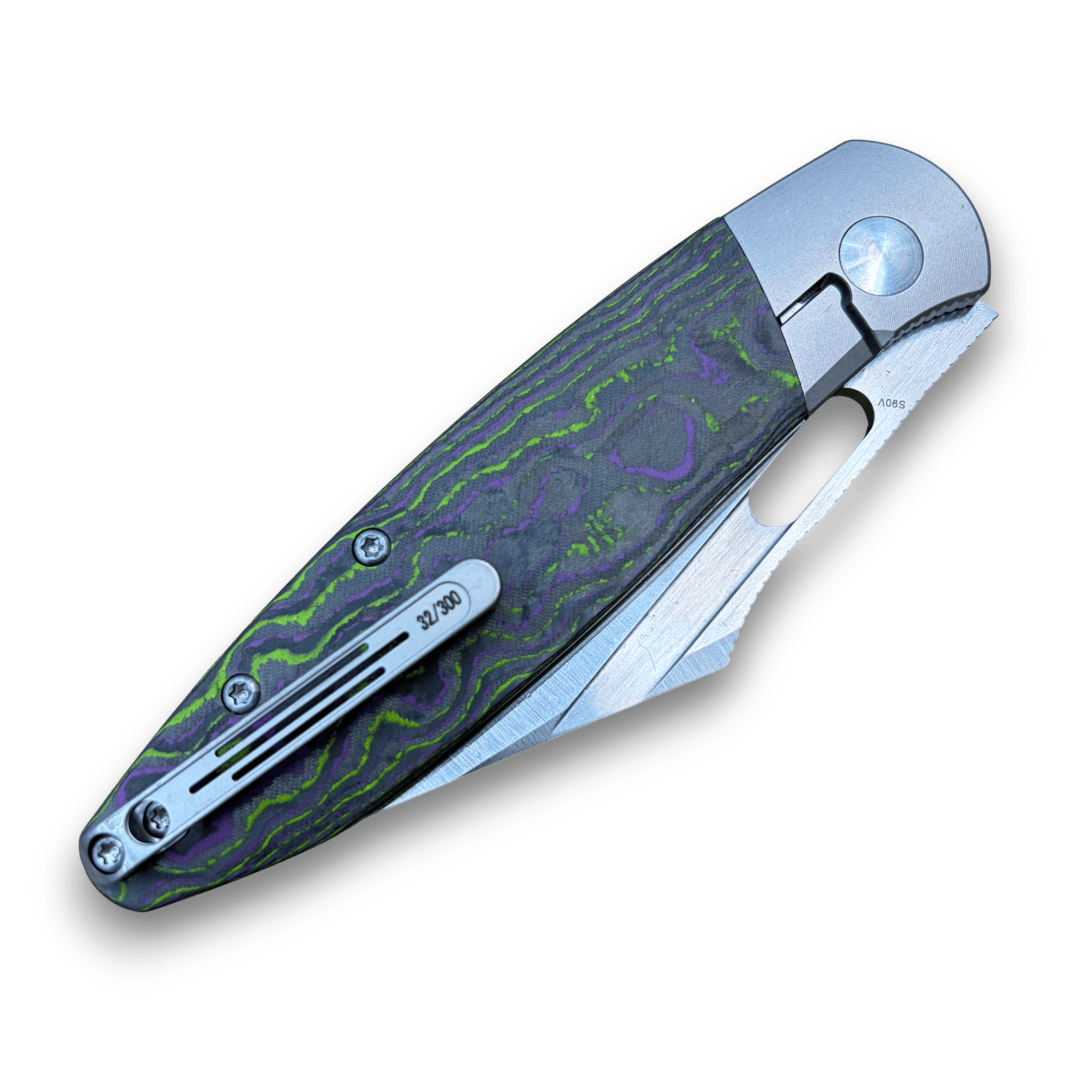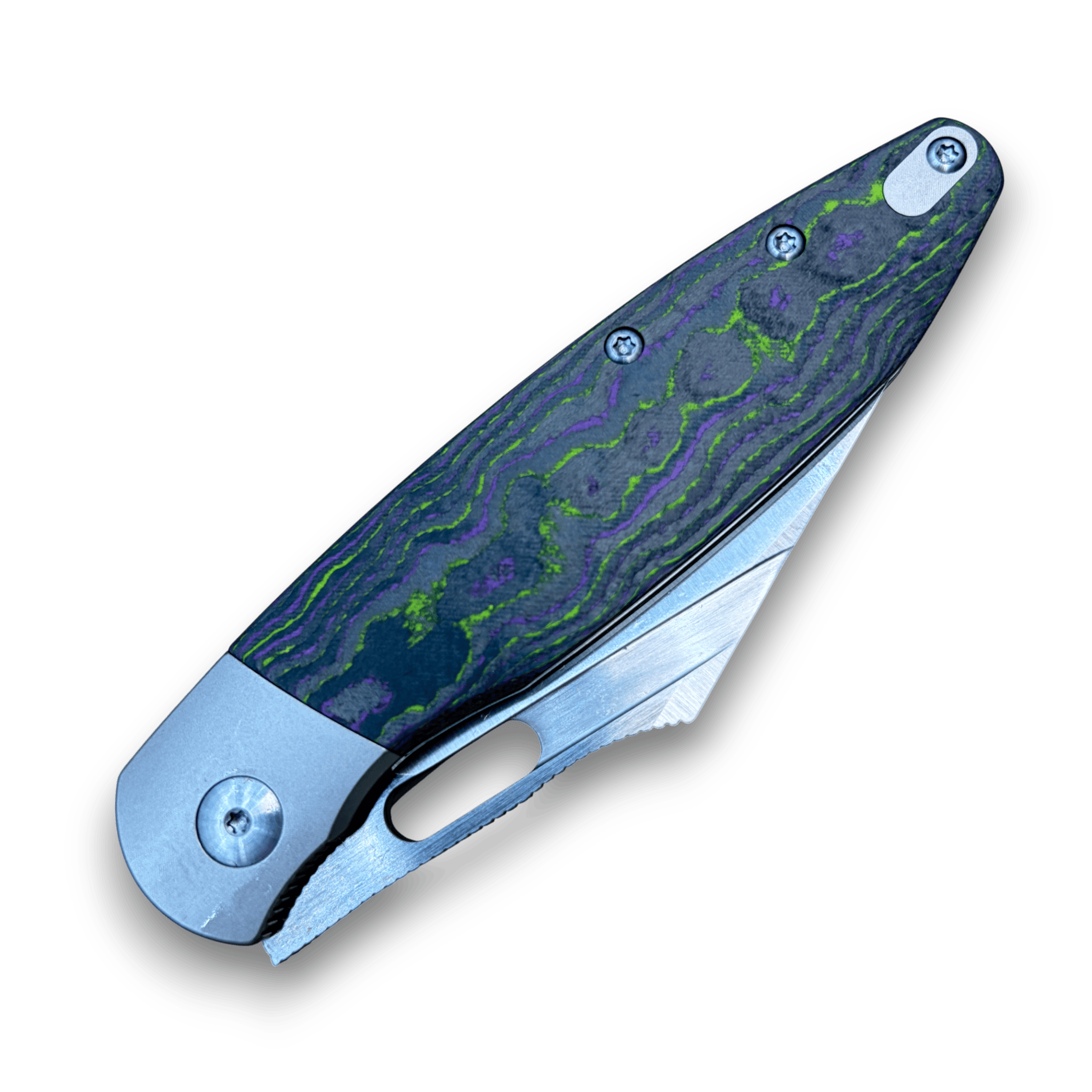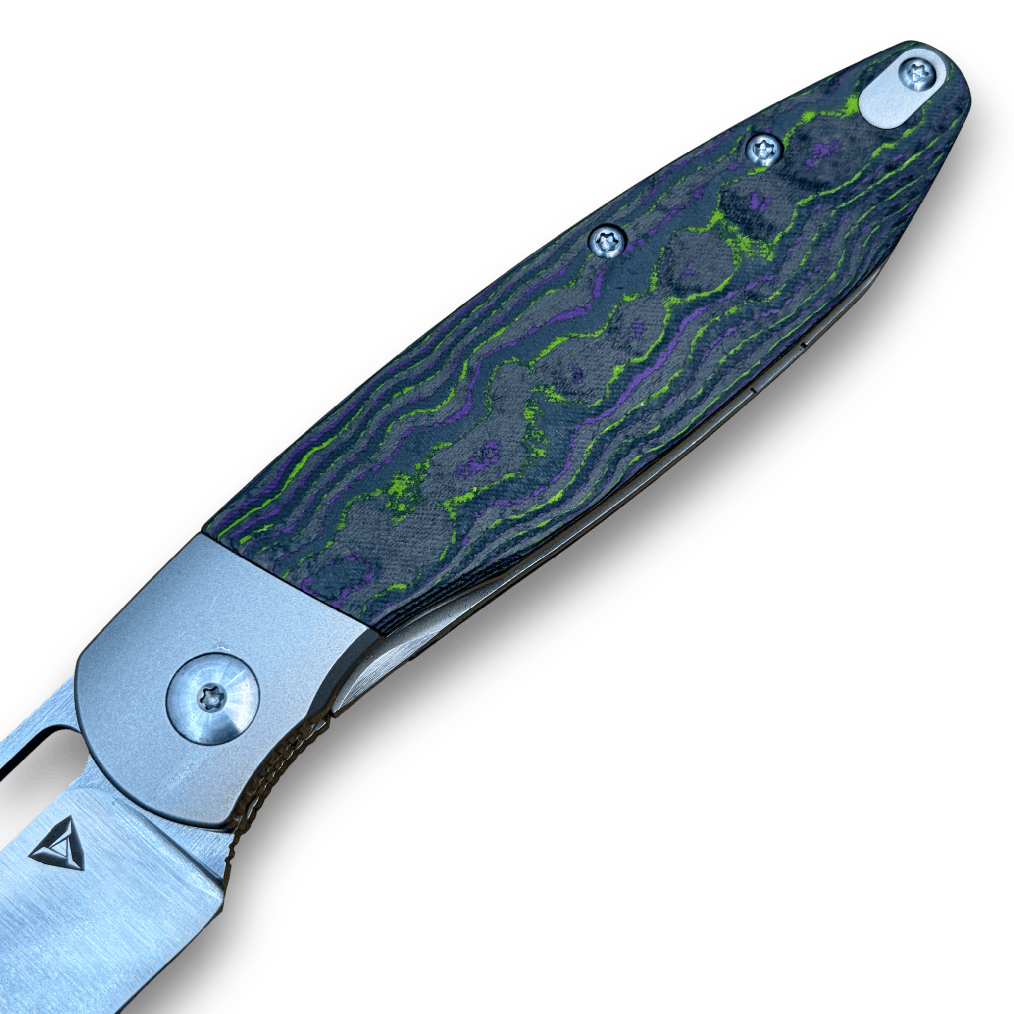 The handle features a titanium bolster lock construction paired with eye-catching Miami Vice or Hulk Camo Carbon handle scales, offering a lightweight yet rigid feel with excellent grip and visual impact. The bolster lock provides confident blade engagement while keeping the knife slim and comfortable in the pocket. With a balanced weight of just 3.7 oz, the Seaxy carries effortlessly while still feeling substantial in hand.