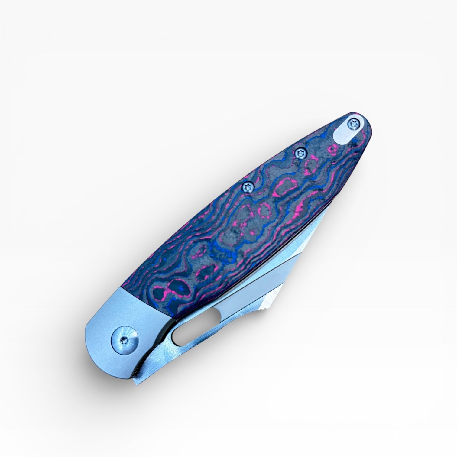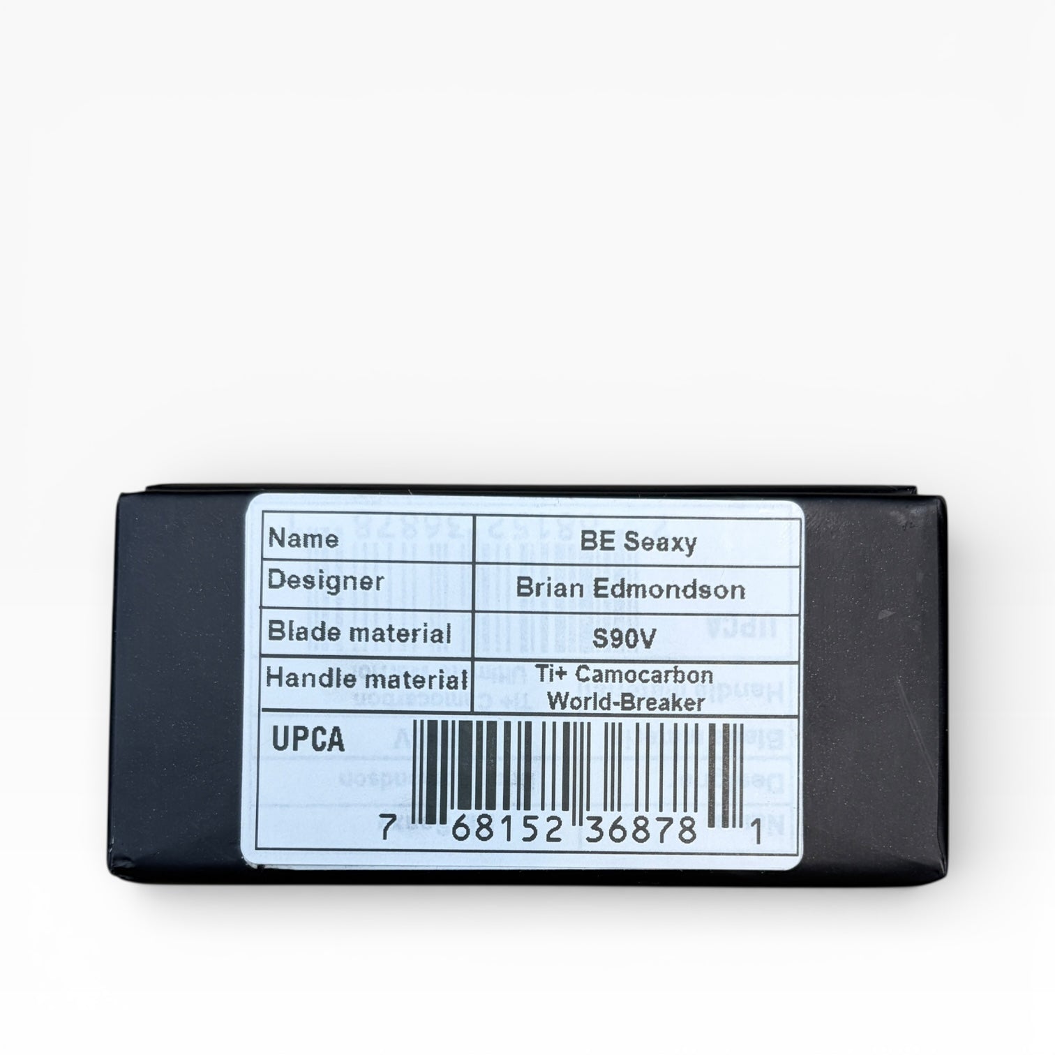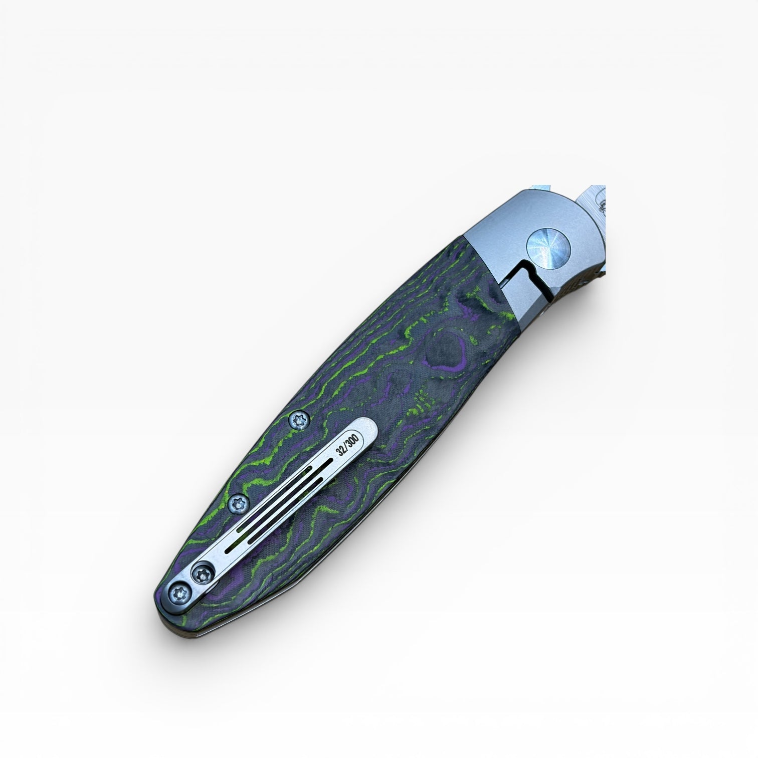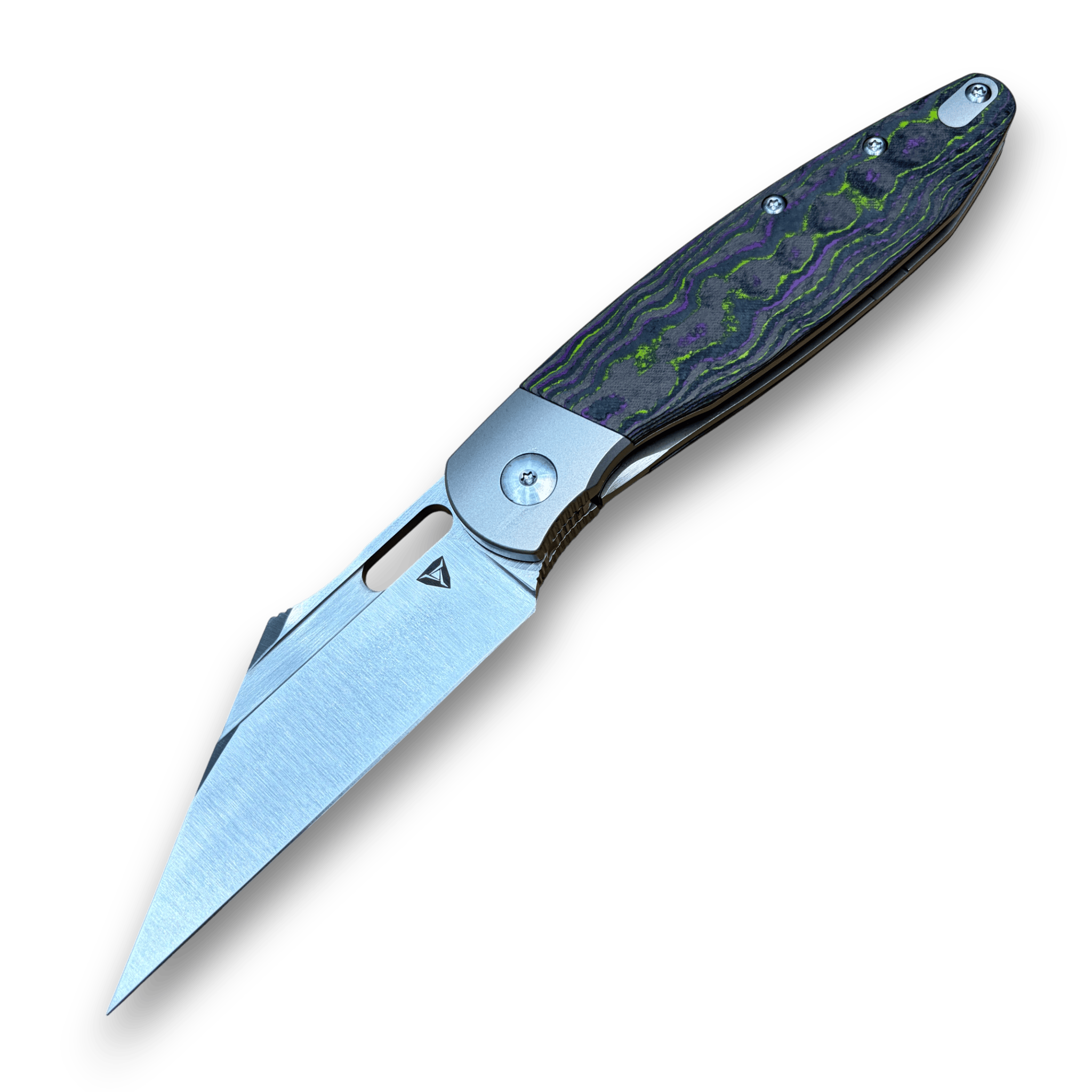 The handle features a titanium bolster lock construction paired with eye-catching Miami Vice or Hulk Camo Carbon handle scales, offering a lightweight yet rigid feel with excellent grip and visual impact. The bolster lock provides confident blade engagement while keeping the knife slim and comfortable in the pocket. With a balanced weight of just 3.7 oz, the Seaxy carries effortlessly while still feeling substantial in hand.