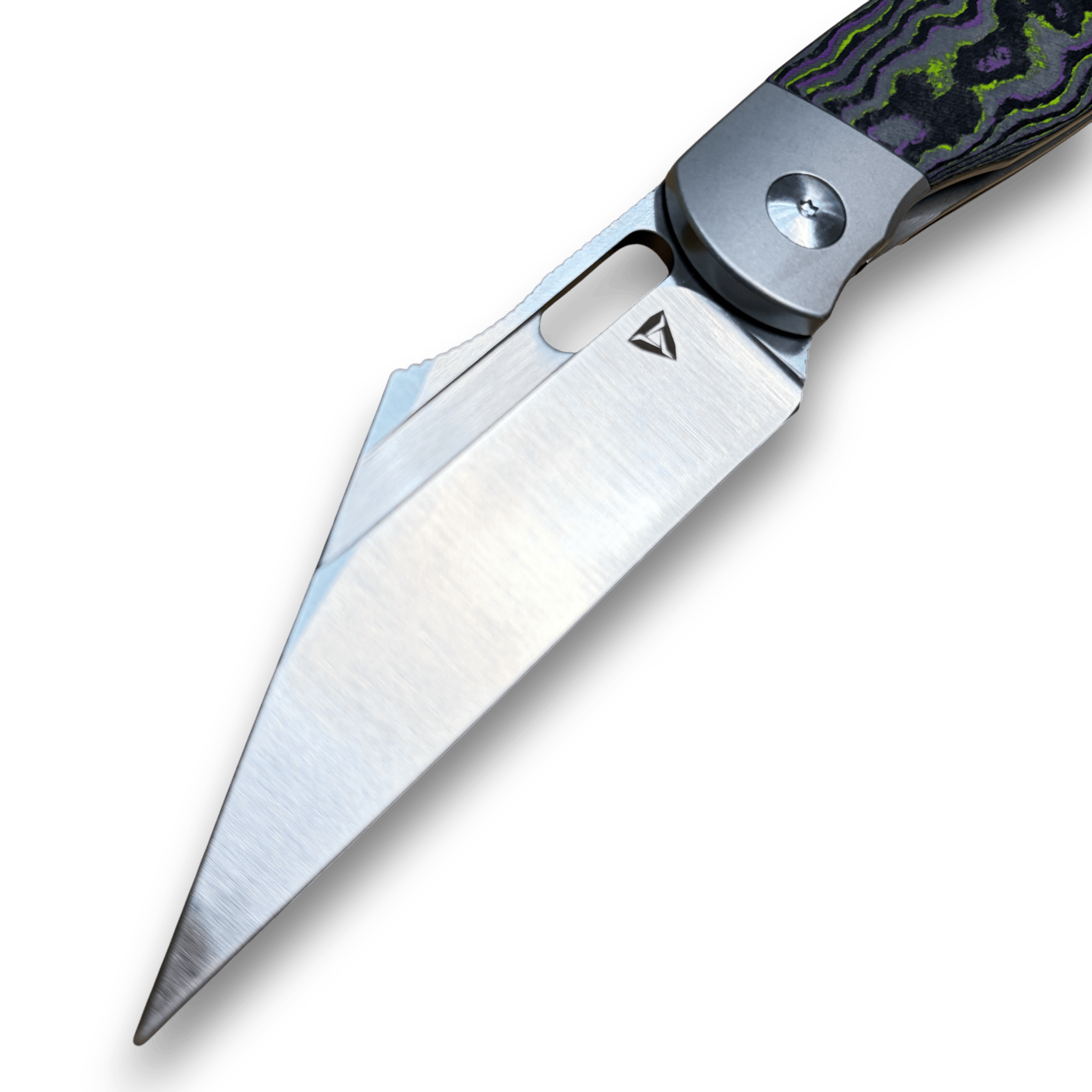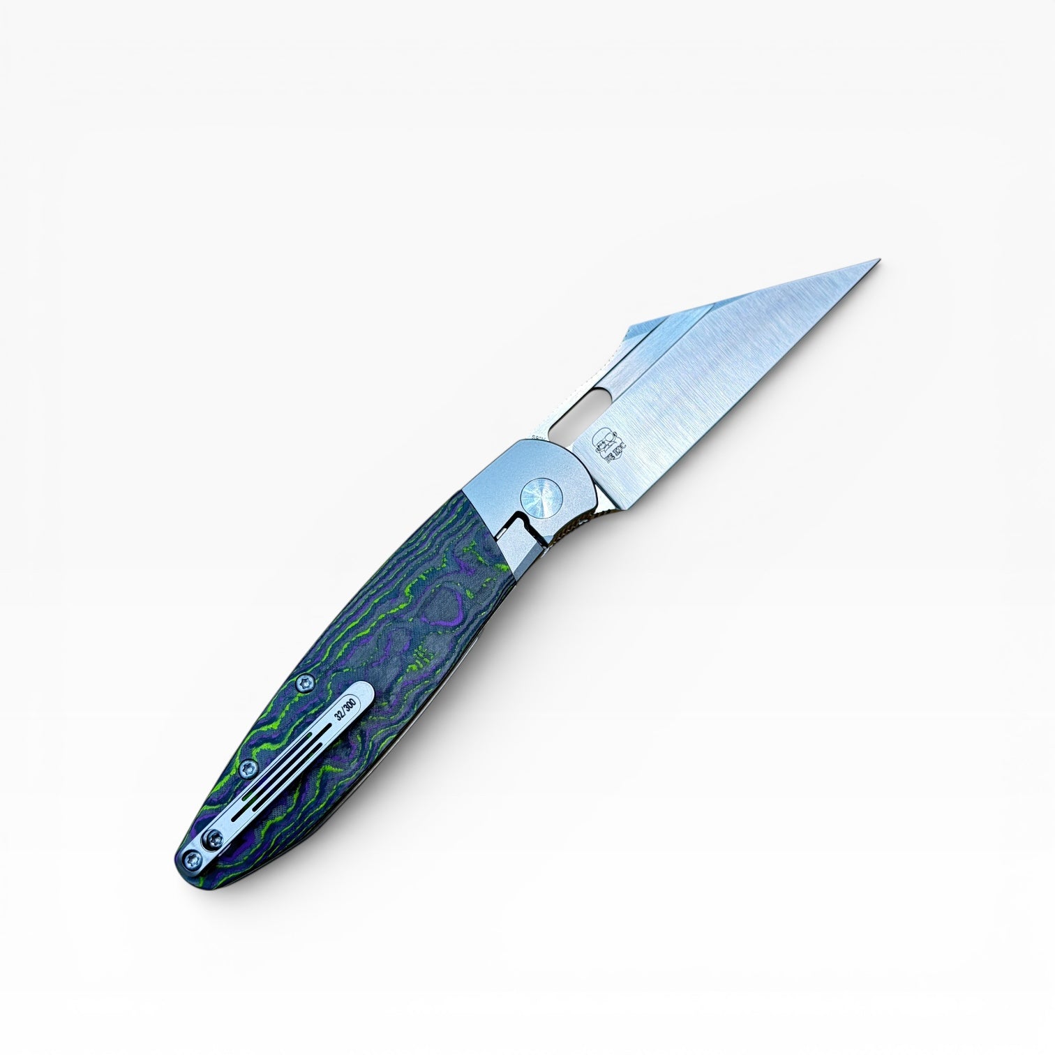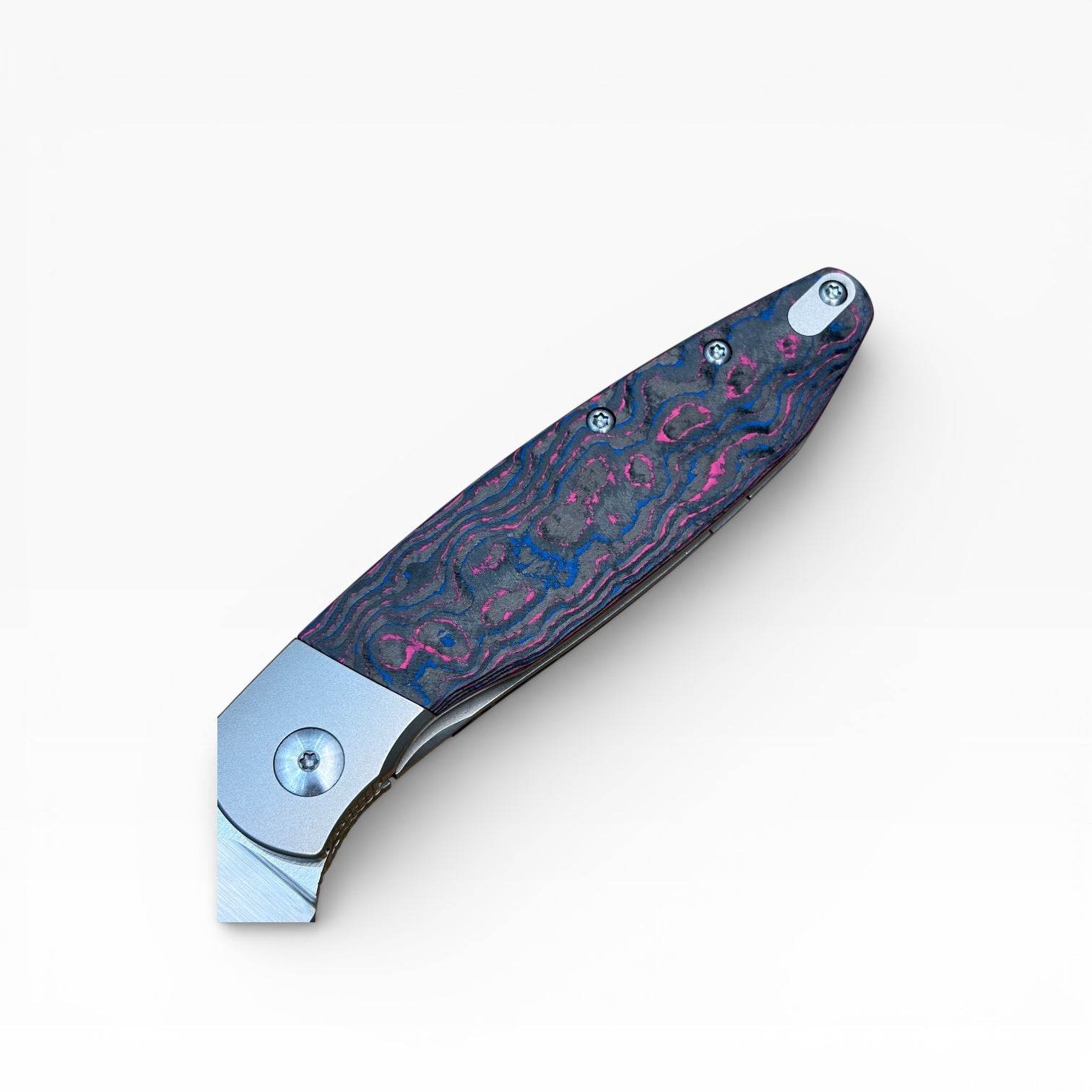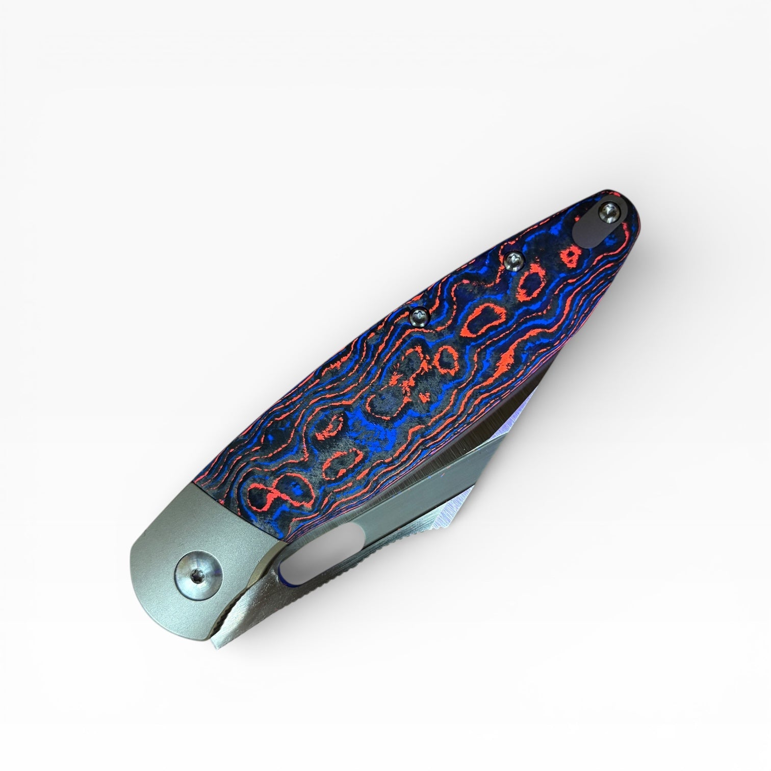 The handle features a titanium bolster lock construction paired with eye-catching Miami Vice or Hulk Camo Carbon handle scales, offering a lightweight yet rigid feel with excellent grip and visual impact. The bolster lock provides confident blade engagement while keeping the knife slim and comfortable in the pocket. With a balanced weight of just 3.7 oz, the Seaxy carries effortlessly while still feeling substantial in hand.