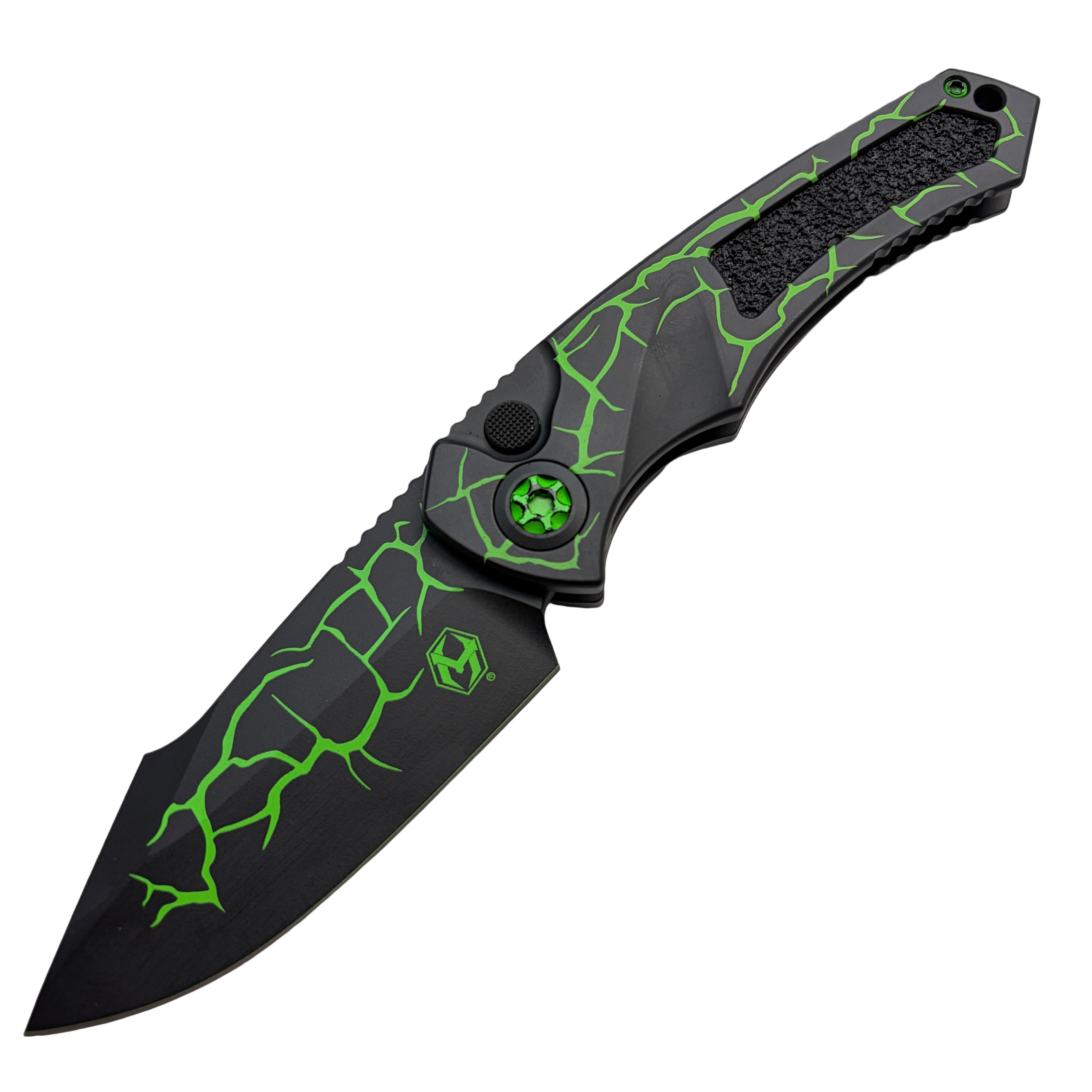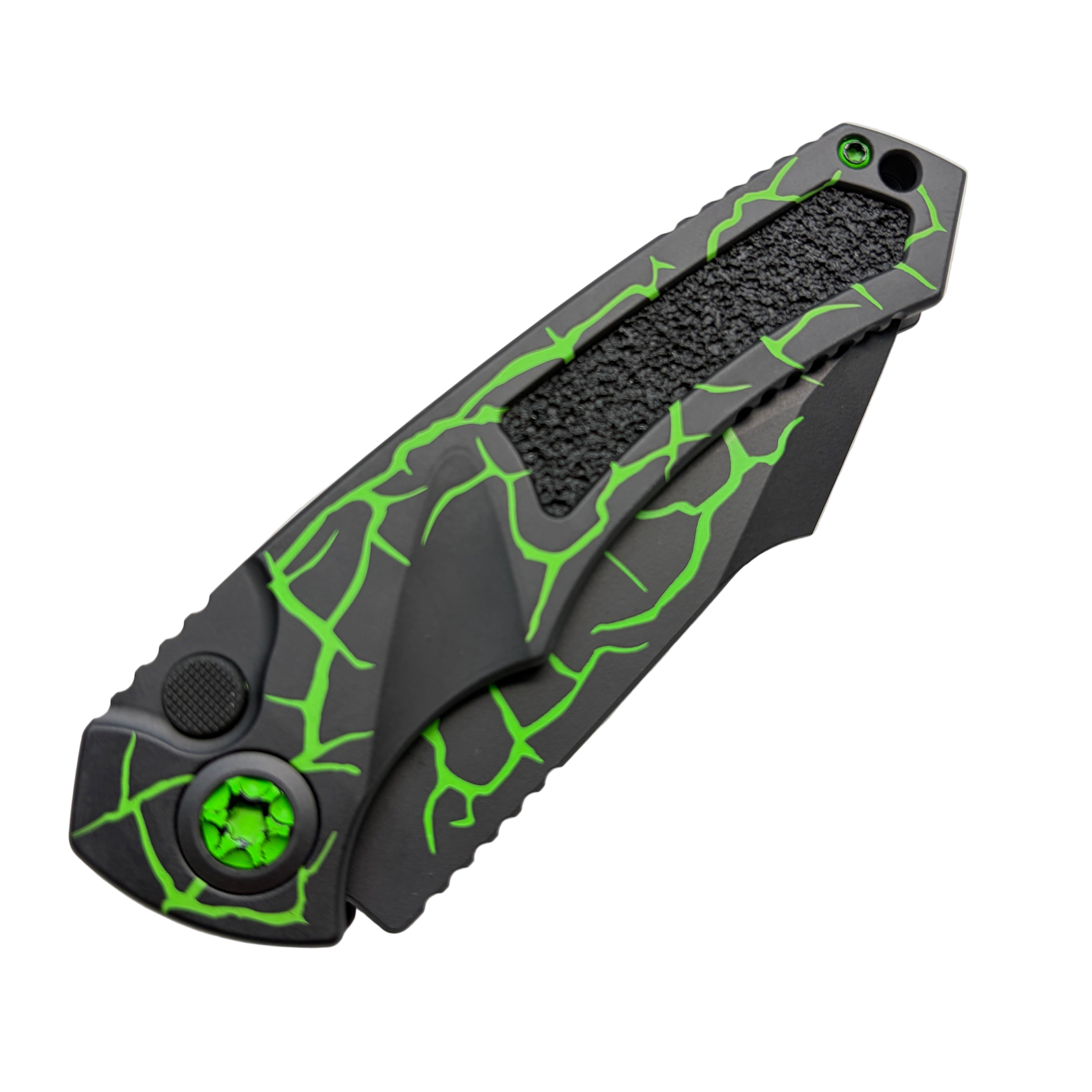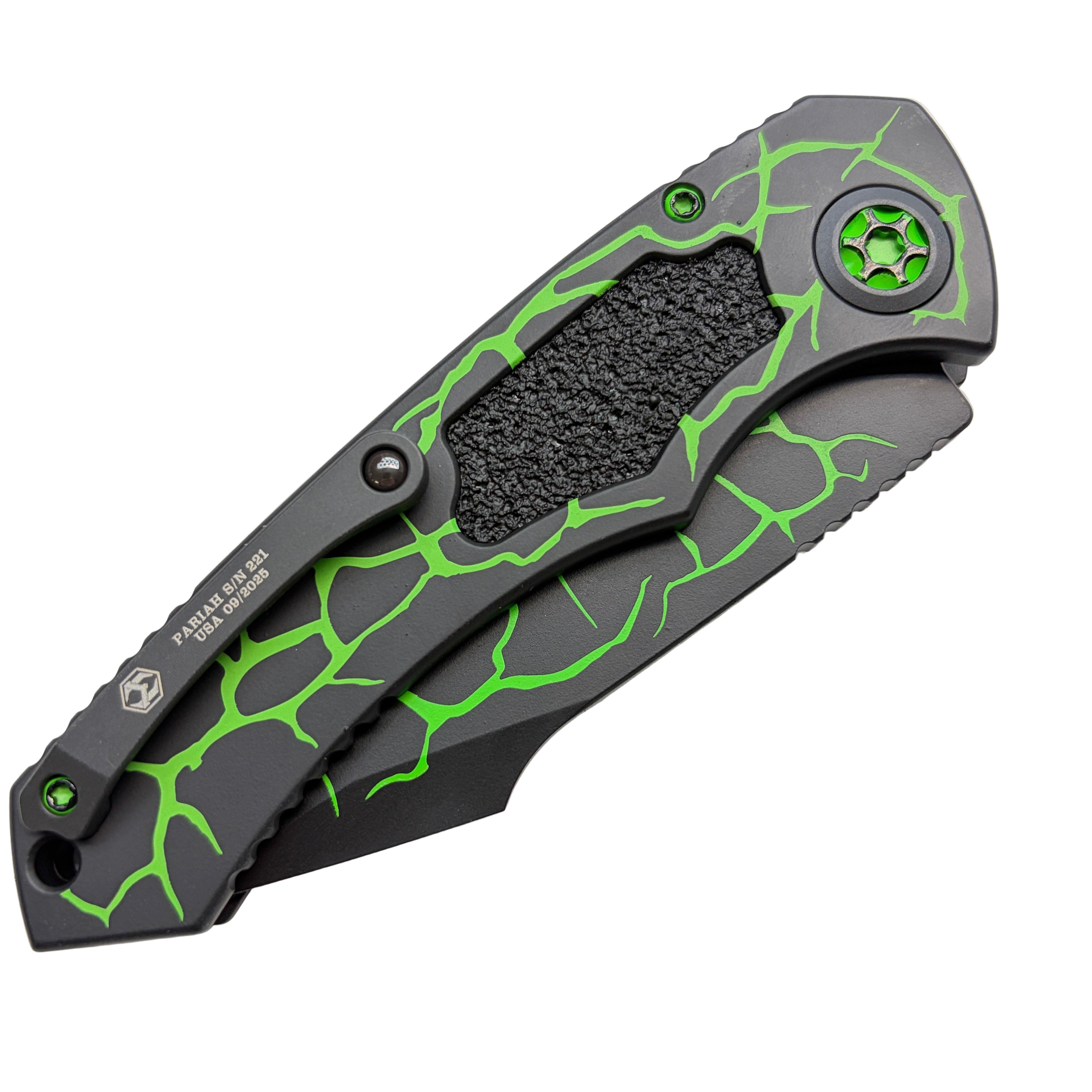 The handle is machined from 6061-T6 aircraft-grade aluminum and finished in a striking Magma Toxic Green, giving the knife a bold, high-contrast aesthetic. Its ergonomic contouring and jimped spine provide a secure, confident grip during rapid deployment or heavy cutting. The push-button automatic mechanism fires with Heretic’s trademark smooth, powerful action and locks up solidly for dependable use.