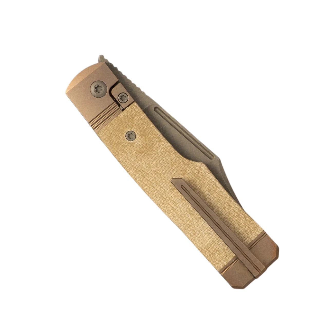 Choose between green linen micarta for a classic textured grip or a titanium handle for a clean, modern aesthetic. Both are paired with bronze anodized titanium bolsters and liners for a premium finish.