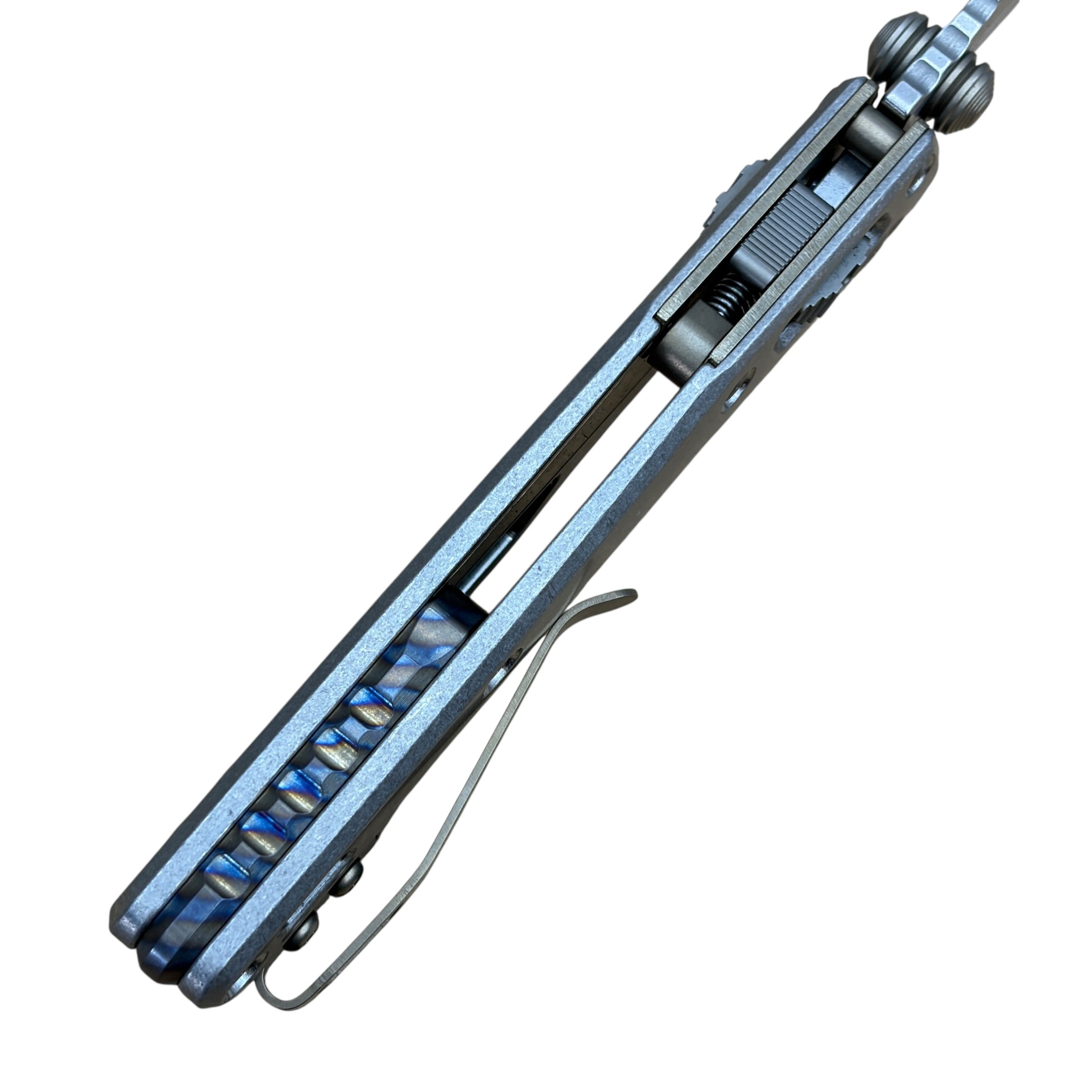 - Flamed titanium pivot and hardware