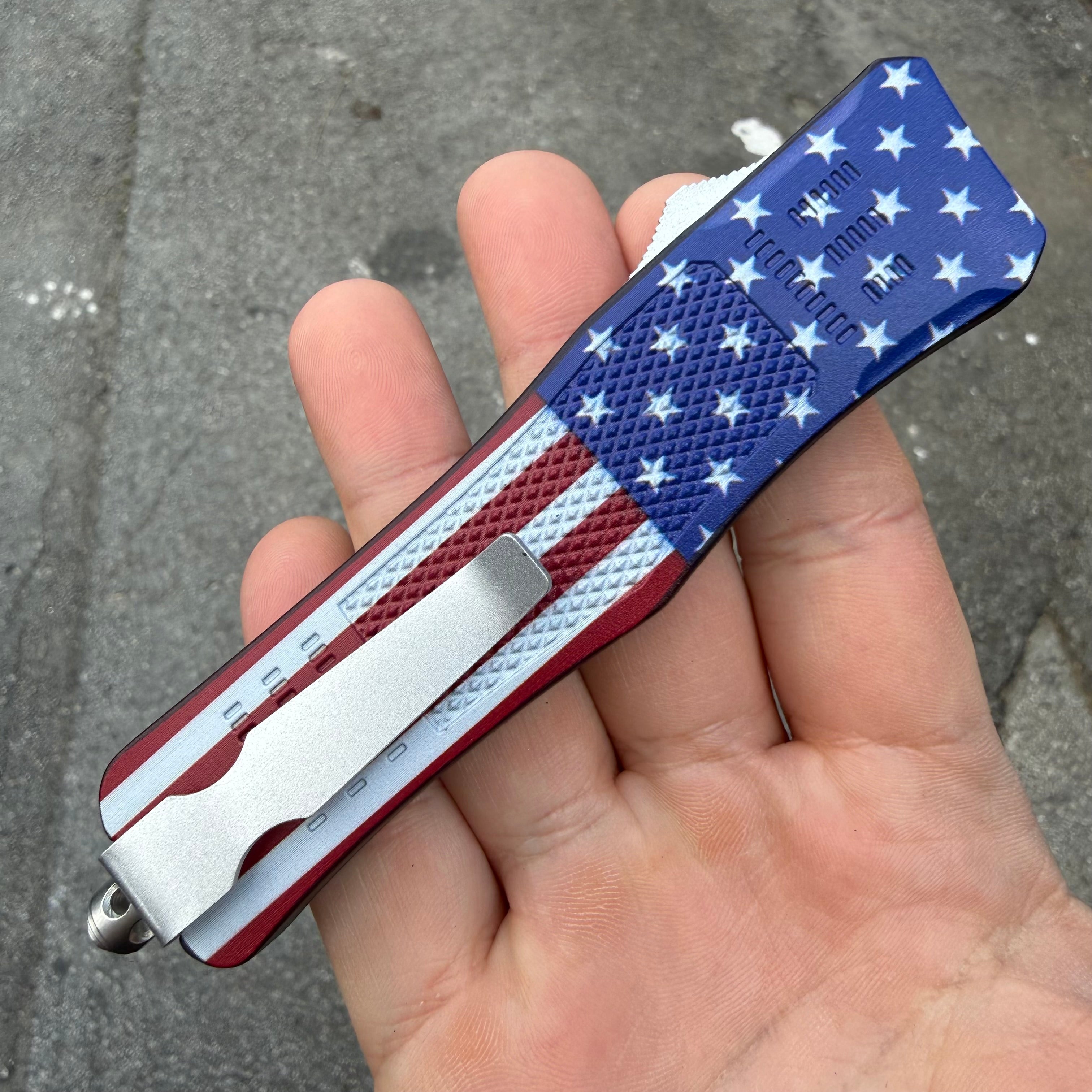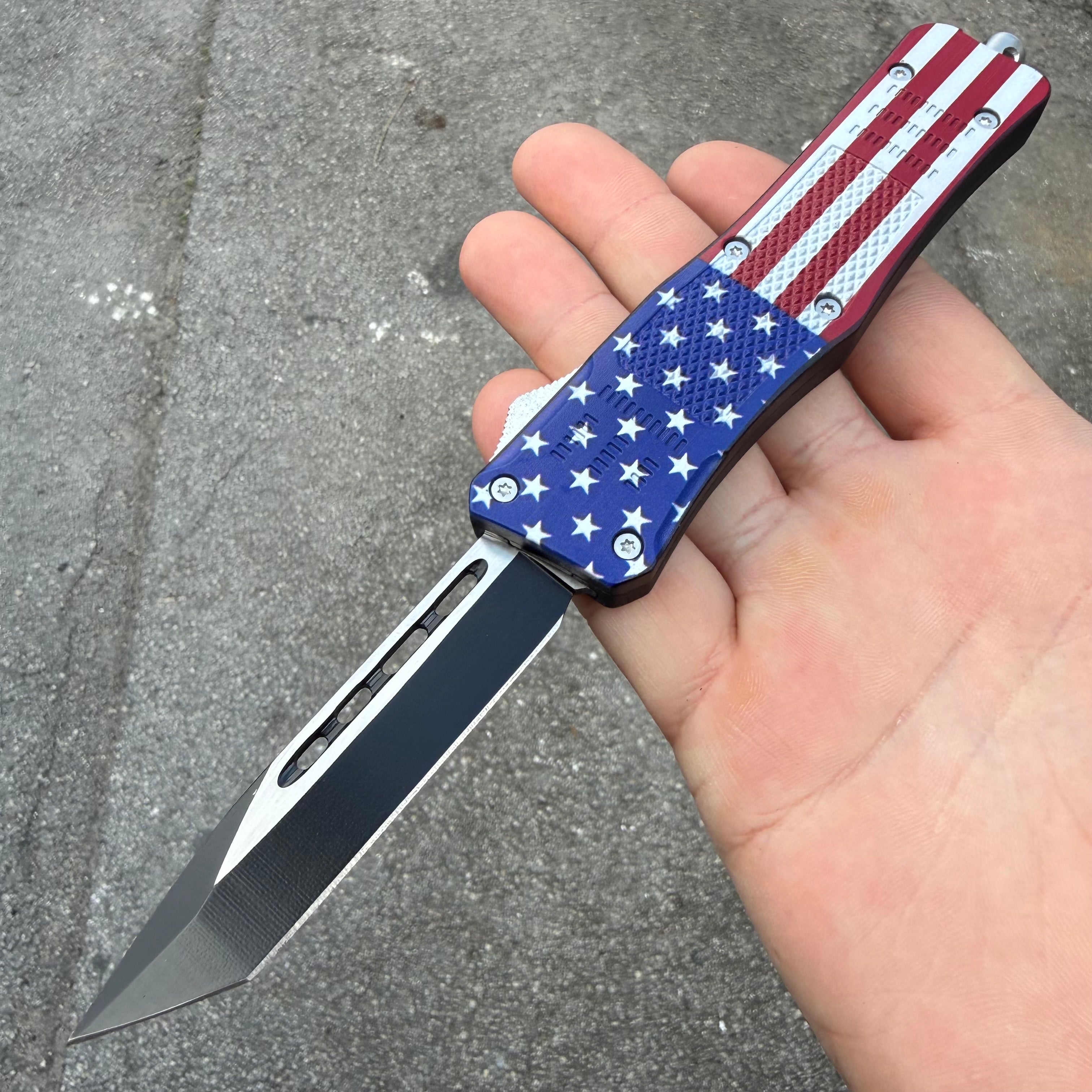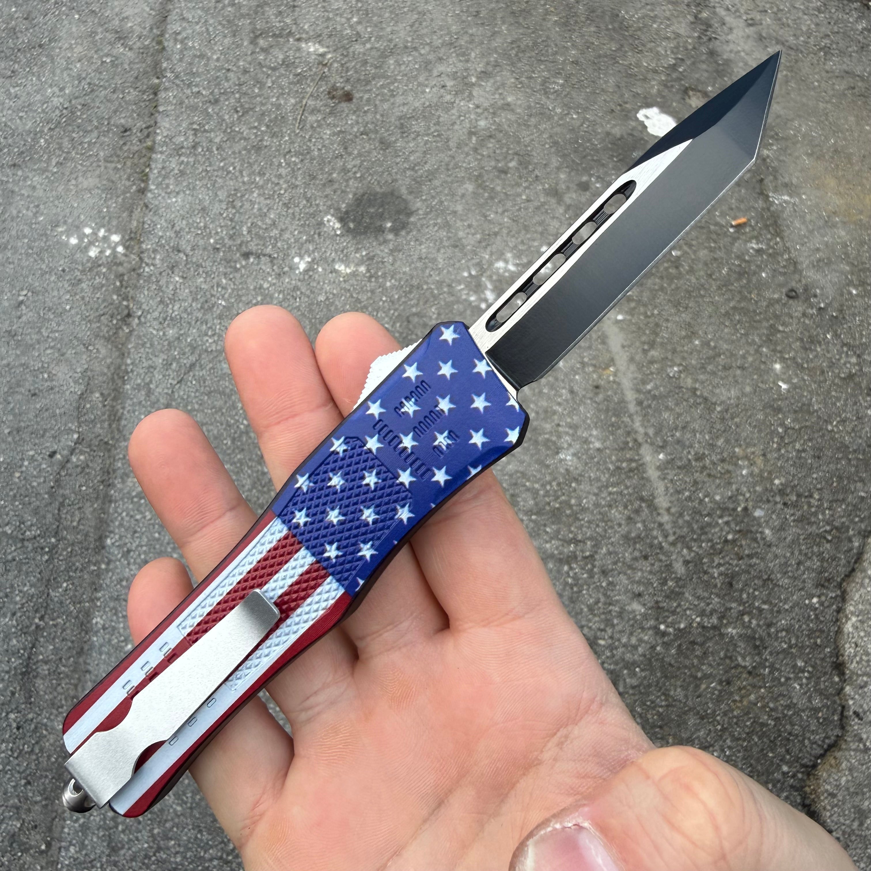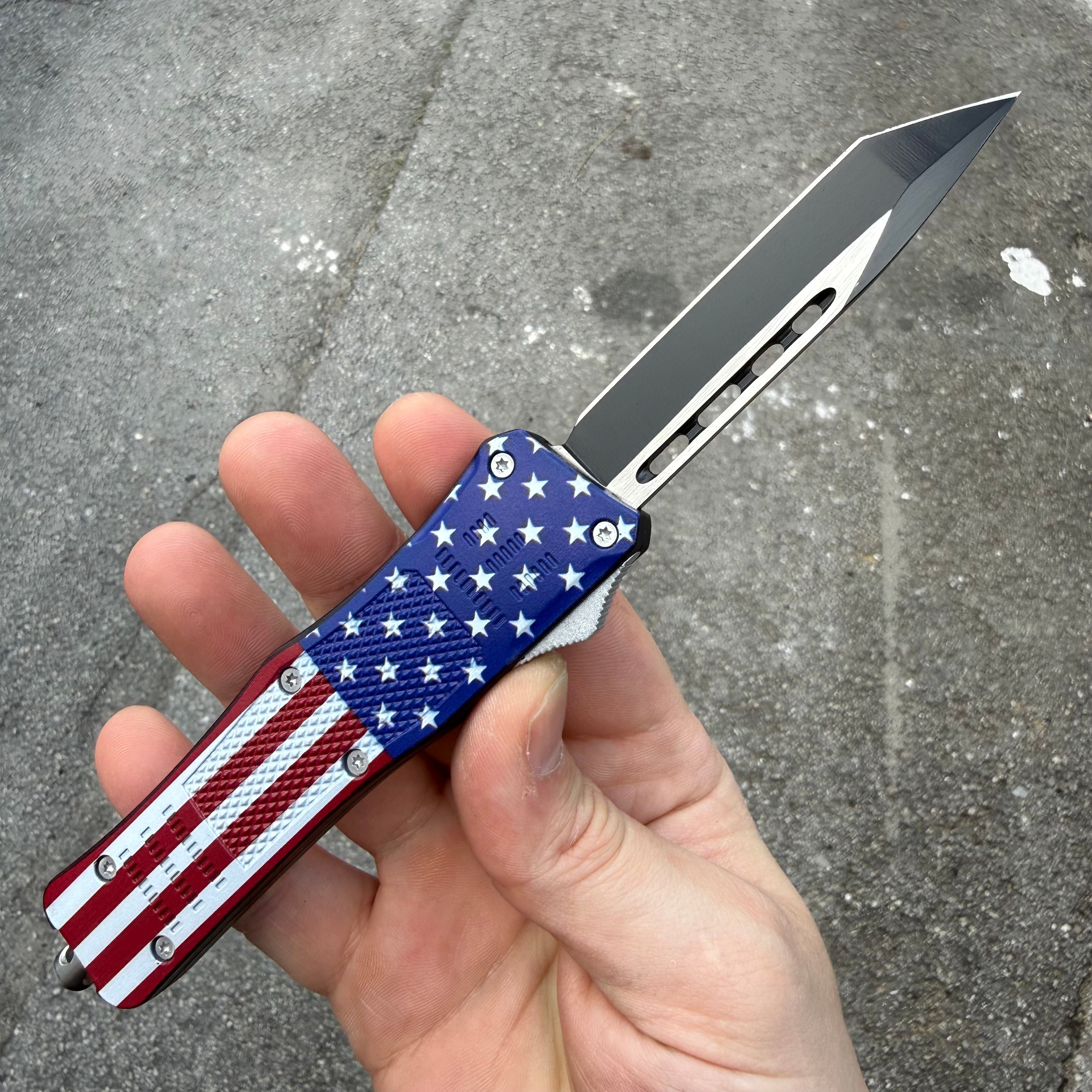 This OTF model has a US Flag finished handle and a two-tone finished dagger blade.